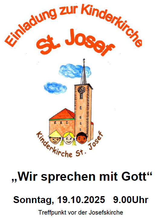 jetzt geht es auch in St. Josef wieder los mit der Kinderkirche. Wir laden Euch herzlich dazu ein am Sonntag, den 19. Oktober 2025 um 9.00 Uhr. Wir treffen uns vor der Josefskirche in der Uhlandstraße. Wir gehen zusammen in das Haus der Begegnung, wo wir unsere Kinderkirche halten.