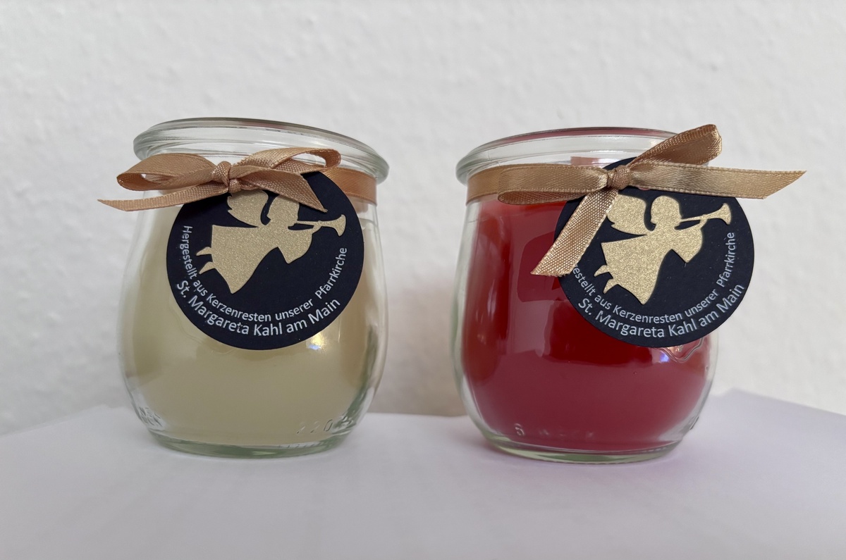 Zur Ehre Gottes erstrahlen in unserer Kirche zahlreiche Kerzen. Aus den gesammelten Resten dieser gesegneten Kerzen hat Ulrike Wollschläger kleine Lichter für Sie hergestellt.