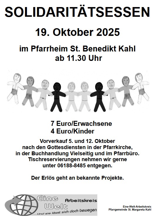 Karten für das Solidaritätsessen gibt es am 5. und 12. Oktober nach den Gottesdiensten, in der Buchhandlung Vielseitig, im Pfarrhaus und bei den Mitgliedern des Eine-Welt-Arbeitskreises zum Preis von 7 Euro/Erwachsene und 4 Euro/Kinder.