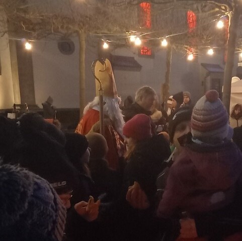 Um das noch gebührend zu würdigen, gab es nach dem Gottesdienst noch einen Adventszauber auf dem Kirchplatz, der im letzten Jahr gemeinsam von der politischen Gemeinde und unserer Pfarrei St. Nikolaus ins Leben gerufen worden war. Auch die Minis waren mit ihren selbstgebackenen Waffeln und den echten Nikoläusen wieder mit dabei, ebenso die offene Ganztagsschule mit Brezeln und Gewürzschnitten. Natürlich dürfte auch der Hl. Nikolaus nicht fehlen, der die Kinder und auch so manchen Erwachsenen beschenkte. Das BOS bereicherte die erfolgreiche Veranstaltung mit Adventsliedern. Bei Kerzenschein, Feuerschalen und illuminierter Kirche kam eine wunderschöne adventliche Stimmung auf. Allen, die mitgeholfen haben, diese Veranstaltung zu einem beeindruckenden Erlebnis zu machen, gilt ein herzliches Dankeschön.
