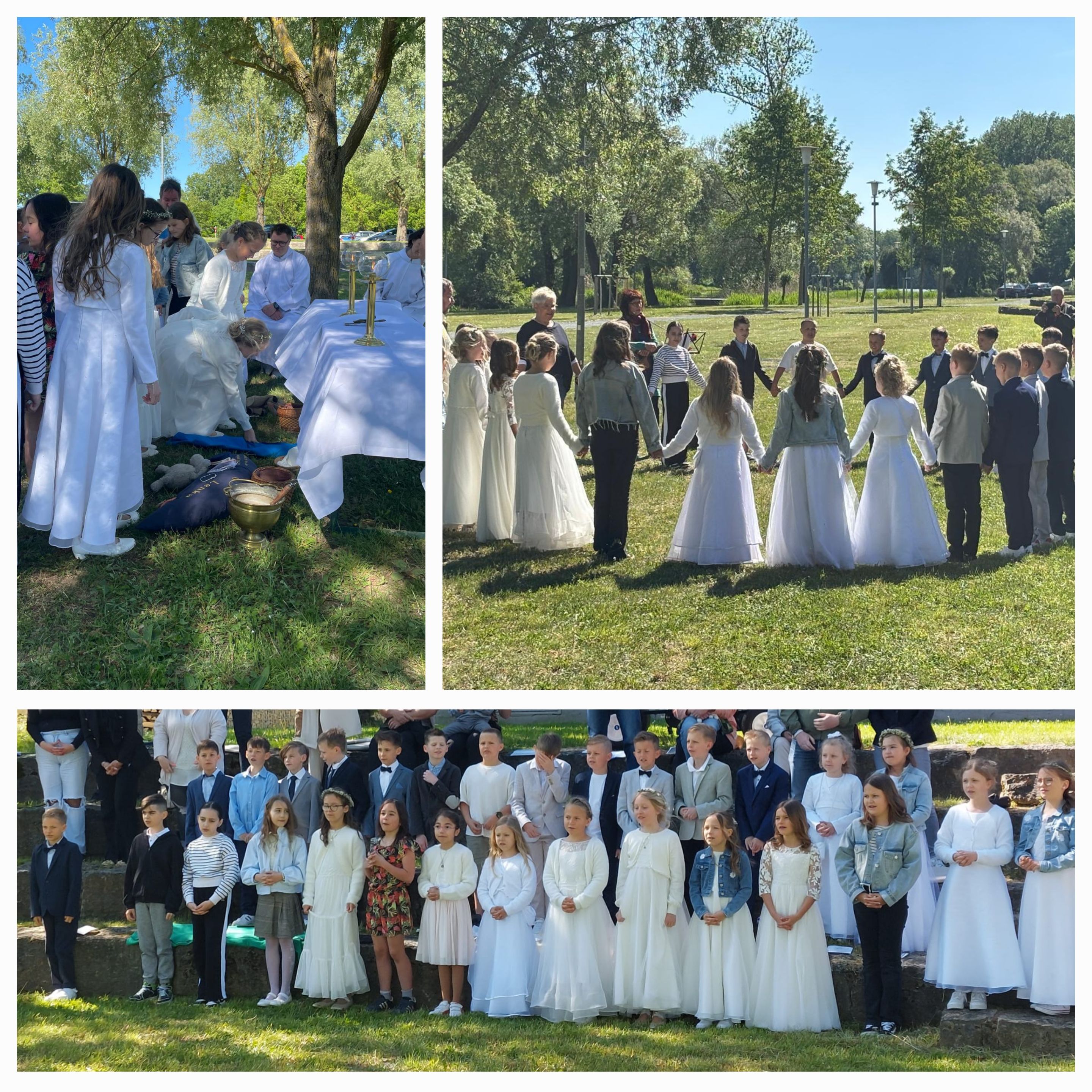 Den restlichen Tag verbrachten die Kinder und ihre Familien im kleinen Kreis – bei gemeinsamen Feiern, Essen und gemütlichem Beisammensein. Doch ganz zu Ende war der Tag noch nicht: Am Abend trafen sich alle noch einmal zur Dankandacht in der Kirche. Die Kinder waren nun sichtbar entspannter – die ein oder andere Frisur verrutscht, Kleider und Hosen mit Flecken vom Feiern, aber die Gesichter durchweg glücklich und zufrieden.