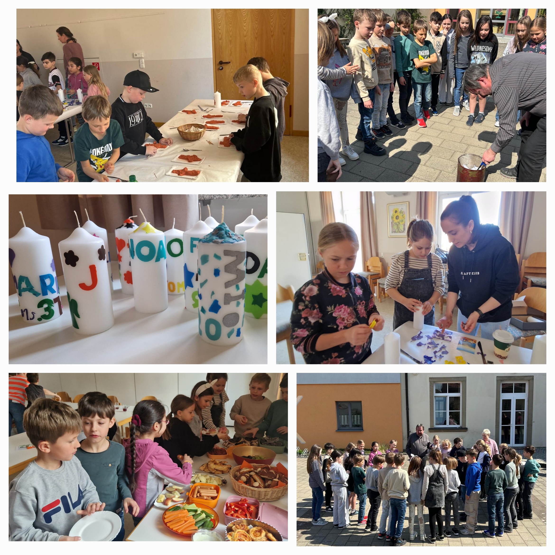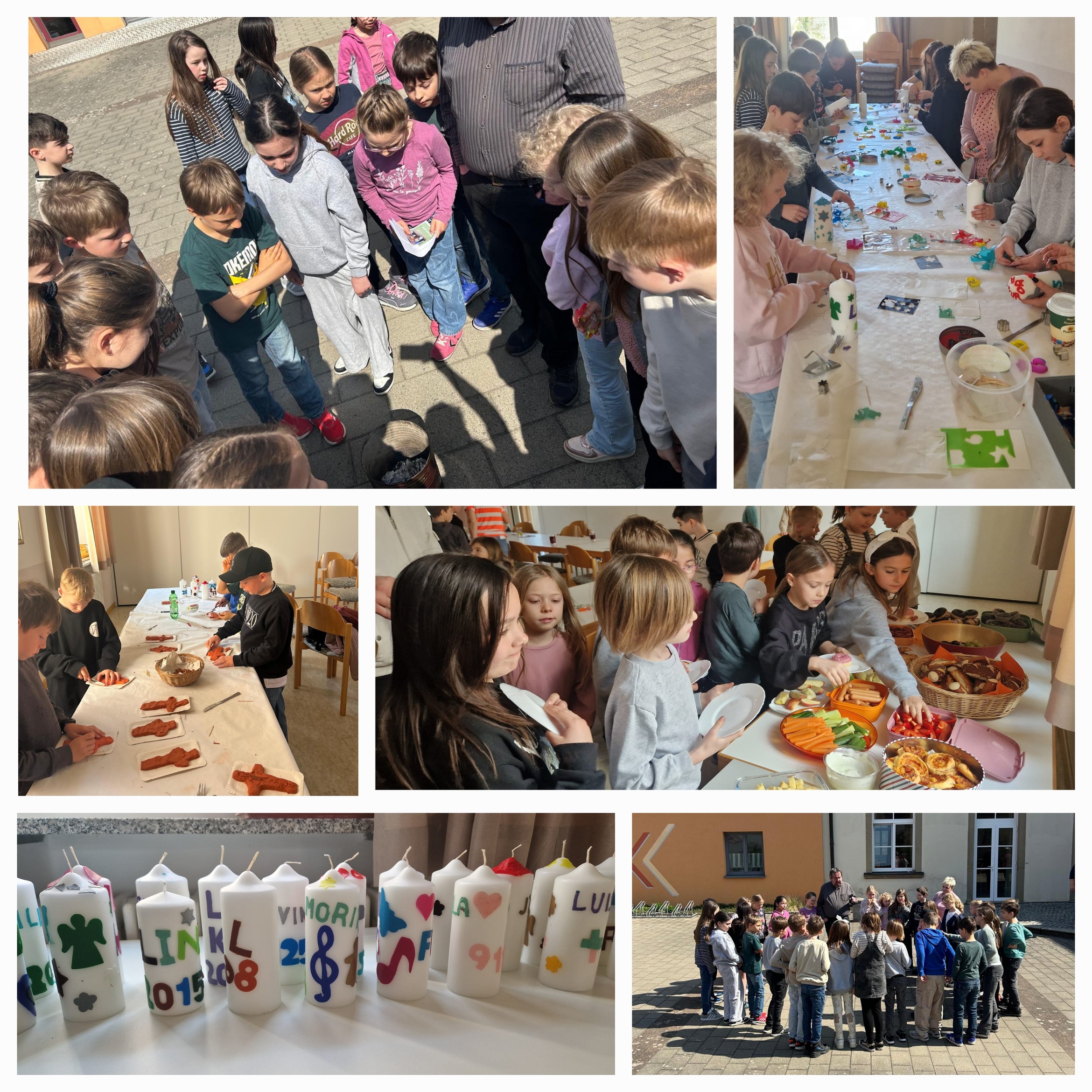 Um die Wartezeit zu überbrücken und den Kindern etwas von ihrer Nervosität zu nehmen, wurde gemeinsam kreativ gearbeitet: Mit viel Freude und Konzentration bastelten die Kinder ihre Tonkreuze und gestalteten eine Kerze. Währenddessen wurden sie nach und nach zur Beichte gerufen. Als kleine Hilfe gegen die Aufregung durften die Kinder auf kleinen Spickzetteln notieren, was sie Gott sagen wollten. Diese Zettel wurden nach der Beichte in eine Schale gelegt.